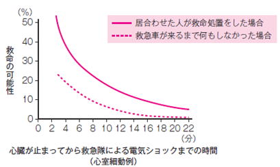 心臓が止まってから、時間経過とともに助かる可能性は低下します。