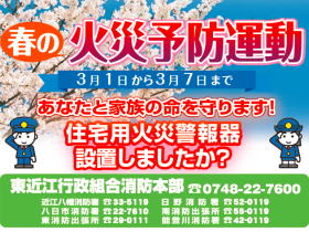 各消防署では、2月29日に管内の大規模商業施設において「街頭広報」を行いました。消防署員東近江防火保安協会員、東近江女性防火クラブ員らが「春の火災予防運動」と「あなたと家族の命を守ります!住宅用火災警報器設置しましたか?」のメッセージ付きのポケットティッシュを配りながら、買い物客らに住宅用火災警報器の早期設置の必要性と春の火災予防運動の始まりを訴えました。