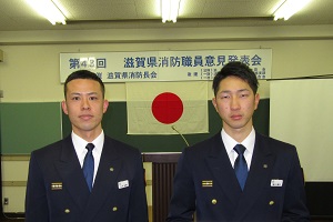 滋賀県にある7消防本部から各2名が出場し、当消防本部からは昨年12月に実施した意見発表会で優秀な成績をおさめた2名が出場しました。